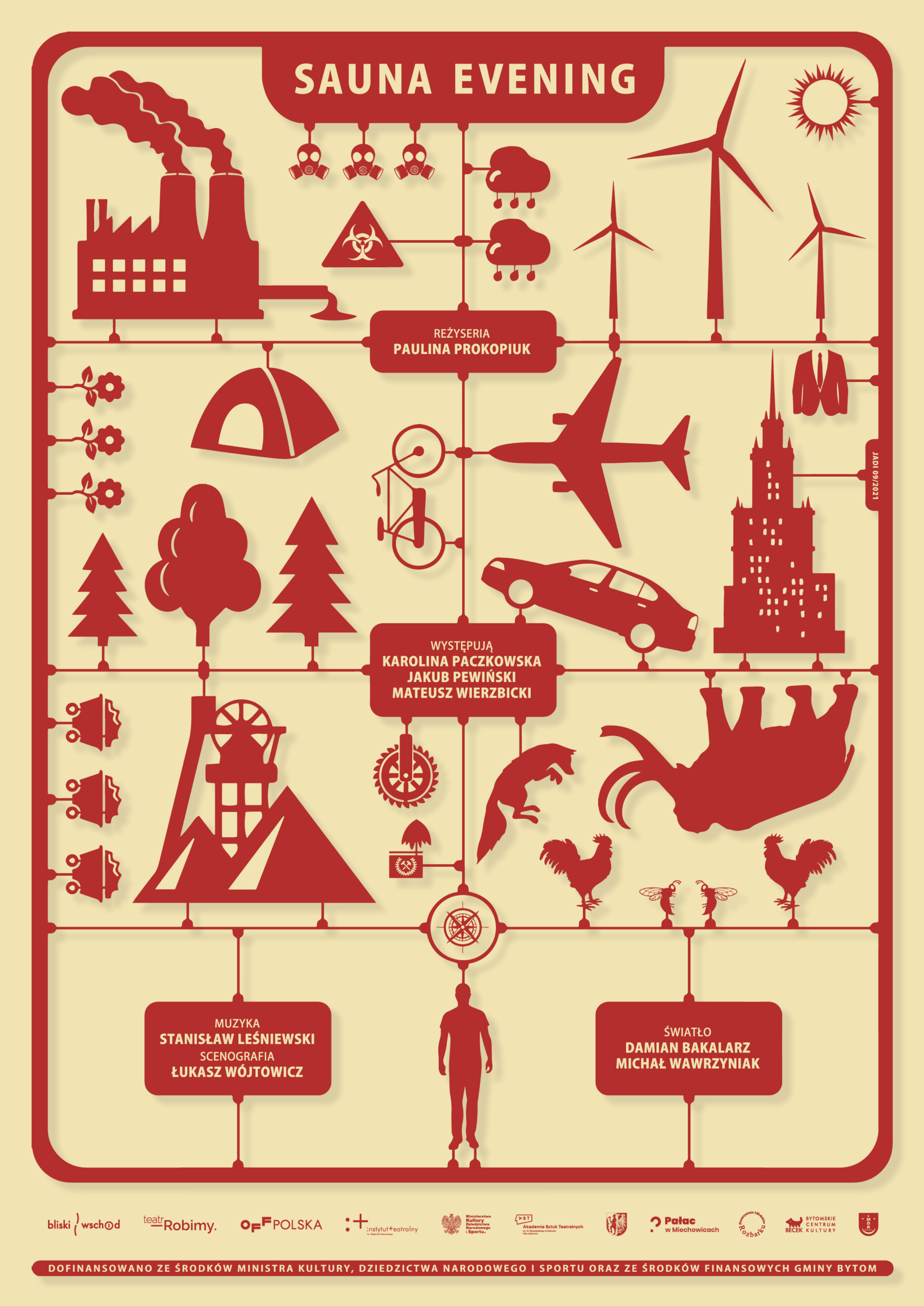„Sauna evening” to spektakl plenerowy, który rozgrywa się w scenografii zawieszonej nad ziemią pomiędzy drzewami. Dotyka złożonego i trudnego tematu transformacji energetycznej – wyzwania, przed którym stoi cała ludzkość. W miejscu gdzie powstał spektakl, w Bytomiu na Górnym Śląsku, ma ona charakter szczególny, ponieważ łączy się z wieloletnią tradycją górniczą. „Sprawiedliwa transformacja” stała się hasłem dla każdej z zaangażowanych w sprawę stron, jednak dla każdej oznacza coś zupełnie innego. Dodatkowo odbywa się ona pod ogromną presją czasu, którą nakłada pogłębiający się w dramatycznie szybkim tempie kryzys klimatyczny. Spektakl jest opowieścią przedstawioną z perspektywy jednostki, która bada swój wpływ na globalny problem. I jak każdy człowiek dąży do osobistego szczęścia, do swojego Sampo.