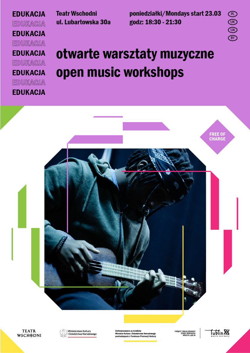 Otwarte Warsztaty Muzyczne w Teatrze Wschodnim w każdy poniedziałek w Teatrze Wschodnim (ul. Lunbartowska 30a) od 18:30 do 21:30. Bez ograniczeń wiekowych – dla początkujących i zaawansowanych.